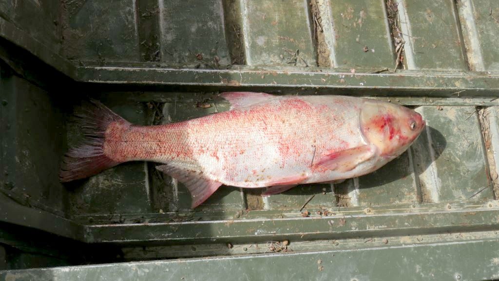 The fish is a Silver Carp, an exotic species from Asia stocked in municipal sewage lagoons in Arkansas by state, federal, and private facilities in the 1970s. Silver Carp and Big Head carp are similar in appearance, and are both exotic species from Asia. They were both stocked because they eat large amounts of plankton and detritus. The Silver Carp differs in that when it’s startled, it can jump up to 10 feet. Both species escaped from where they were originally stocked throughout the South and have since made their way up the Mississippi into the Arkansas and White rivers. Though rare, they are also found in the Ouachita River.